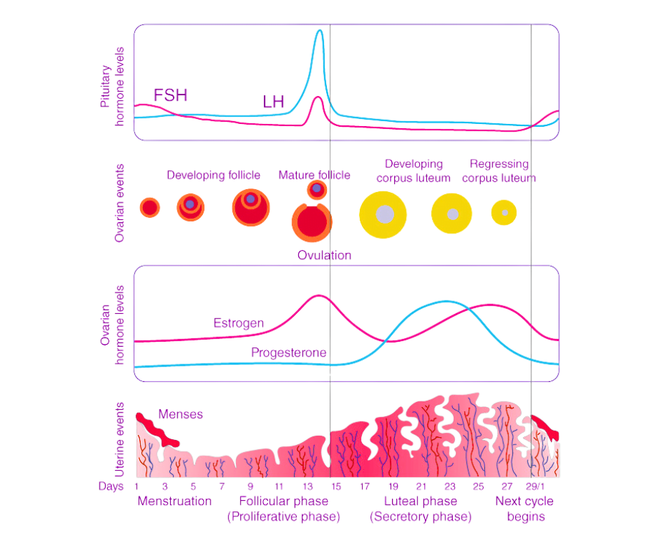 • The levels of LH and FSH reach their peak at mid-cycle, around 14th day.
